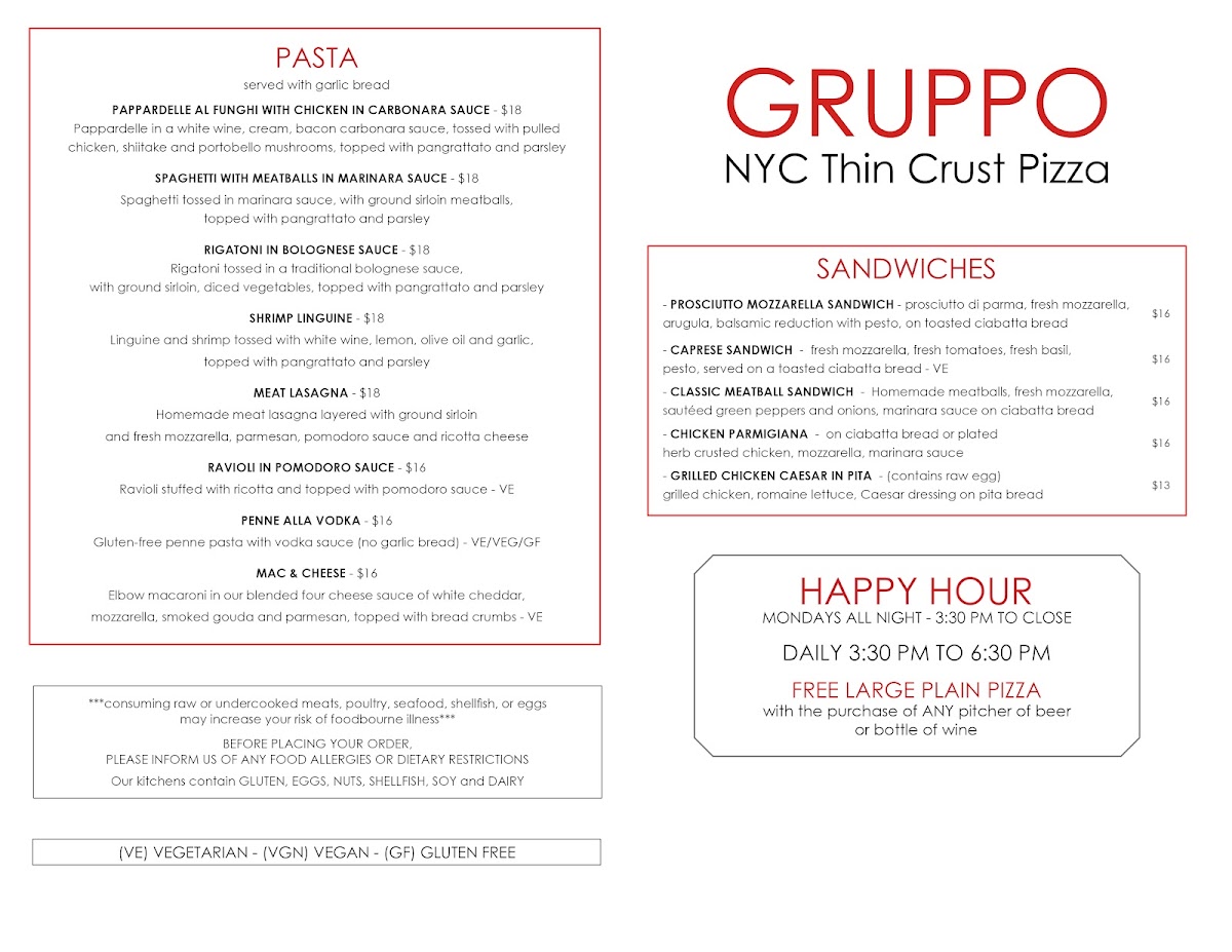 Welcome to Gruppo NYC Thin Crust Pizza, tucked away on Avenue B in New York. This culinary gem specializes in delightful thin crust pizzas that elevate traditional flavors into a vibrant dining experience. Notably, the personal-size plain pizza comes with a luscious marinara sauce and cheese, priced at just $12.50, while gluten-free options crafted with a unique cauliflower base are also available. Pizza lovers will rejoice in the Classica Margherita, topped with fresh mozzarella and ripe tomatoes.